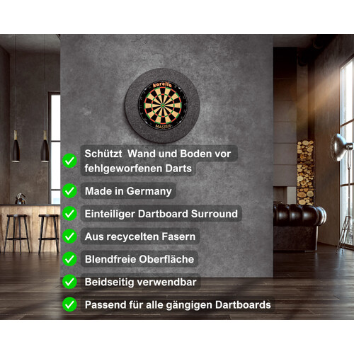 Der erste Surround Made in Germany , der Oeko-Tex zertifiziert ist. Bei dem einteiligen Catchring Ultimo setzt Karella auf ein völlig neues Material. Der Auffangring ist aus recycelten Fasern hergestellt, zu 100 % schadstofffrei und ganz ohne chemische Zusätze. Das Material wurde in einem eigens entwickelten Herstellungsverfahren auf die ideale Dichte komprimiert. Diese einzigartige Beschaffenheit sorgt dafür, dass die Steeldarts bei einem Fehlwurf im Ring stecken bleiben und nicht den Catchring durchdringen. Hierdurch kann garantiert werden, dass Wand und Boden geschützt sind sowie ein leichtes Herausziehen möglich ist. Nach dem Entfernen der Darts bleiben auf der grauen blendfreien Oberfläche keine sichtbaren Spuren zurück. Wir übernehmen Verantwortung Das Öko zertifizierte Material vom Karella Surround Ultimo ist einzigartig im Dartsport. Made in Germany Aus recycelten Fasern hergestellt Oeko-Tex Zertifiziert 100 % schadstofffrei Formstabil, robust, langlebig Allergikerfreundlich