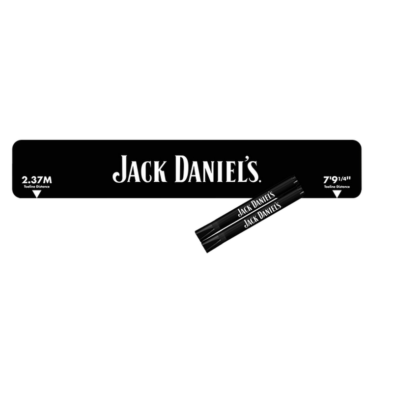 Jack Daniels Home Darts Center mit allem was man für das Dartspielen braucht! Jack Daniels Axis Dartboard aus brasilianischem Sisal im exklusiven, schwarz-weißen Jack Daniels Design. Komplett schwarzes Dartboard Cabinet im exklusiven Jack Daniel’s Design, passend für alle gängigen Sisal-Dartboards. Verstärkte Scharniere, geschützte Kanten und eine solide Rückwand machen das Dart-Kabinet sehr robust und widerstandsfähig. Auf der Innenseite der aufklappbaren Türen ist jeweils ein Scoreboard verbaut, das mit dem dabei liegenden Marker beschrieben und problemlos wieder abgewischt werden kann. Das Kabinet kommt mit einer Aufbauanleitung und dem passenden Befestigungsmaterial. Abmessungen:Höhe: 61 cmBreite (geschlossen): 52 cmBreite (geöffnet): 102 cm Zwei Sets Jack Daniels Brass Steeldarts Eine Abwurflinie und zwei Marker für die Scoreboards